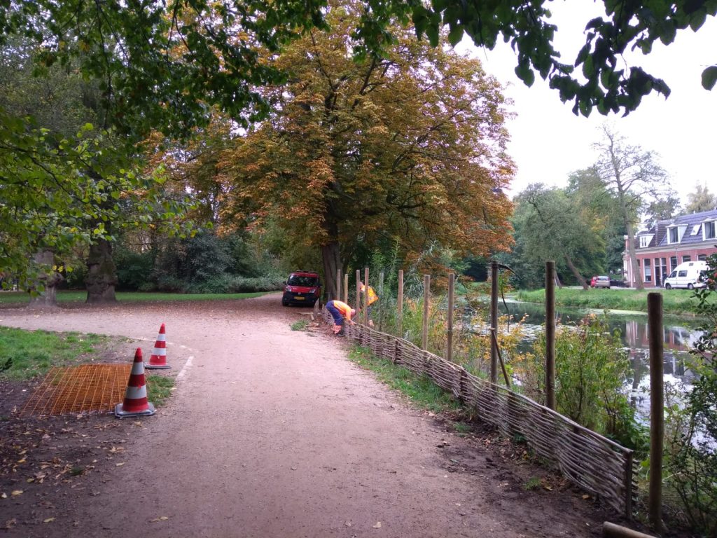 De gemeente heeft de zwemplek achter Zondag in het Noorderplantsoen afgelopen jaar minder toegankelijk gemaakt voor honden. Er is beplanting neergezet en om beschadiging van de nieuwe aanplant te voorkomen is er tijdelijk ook een natuurlijke afscheiding geplaatst. Vorig jaar december is het gevlochten wilgentenen hekwerk geplaatst, om zo de overlast van zwemmende honden tegen te gaan. Dat leek wel te werken, maar toch is het blijkbaar onvoldoende. Het hek wordt nu hoger met betonmatten die op het talud worden geplaatst. Dit als extra bescherming van de planten.